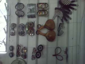 After the session, I felt inspired to actually walk around the Kuona Trust workshops to visit the various artists at their work places & get a gist of what goes on through a writer’s mind & boy wasn’t that a good idea! I literally had a field day! Among other artists, I met Cyrus Kabiru, a shy but overly talented artist dressed in a funky old grey overall that sort of depicts a scenario of ,”Twende Kazi!” Cyrus refused to tell of his age but one thing that would definitely remain ageless is his eye wear antics that BTW have themes and are just awesome! If I were a musician I would hire all his shades for the funkiest video shoot to ever hail from this side of the Sahara!