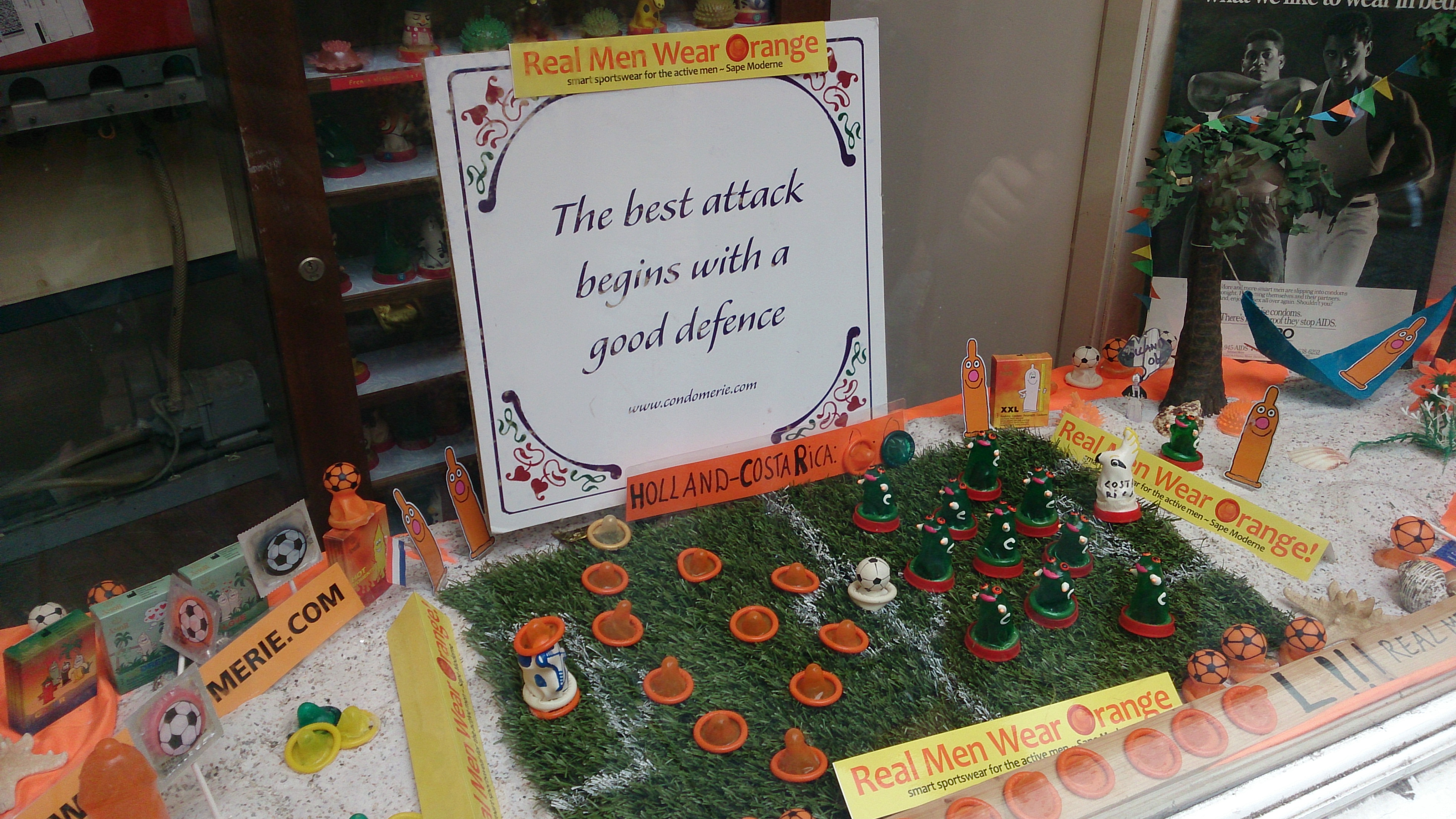 Tonight I see the RLD in different light. (It’s the busiest I’ve seen any street, day or night, during my entire stay in Netherlands). It’s the first time I am experiencing human traffic. There are so many people, among them, more than half dressed in orange jerseys, walking up and down RLD lanes. Everyone (the Dutch and tourists alike) has been wearing orange all day, in support of Netherlands at World Cup, so there’s no way of knowing nationalities of people along RLD, tonight largely dominated by men. My friend says a lot of the guys down RLD are usually Brits. And leaning on that statement, I overhear several British accents along the crammed and jammed street. I wonder if there are male or homosexual prostitutes too, somewhere. They can’t miss to have their spot in a place like Amsterdam—the city with something for everyone. We spot a couple of policemen along the canal bridges dressed in their “Politie” jackets, standing at bay watching people stream in and out of the district. They are possibly looking out for trouble. But there is never trouble.
