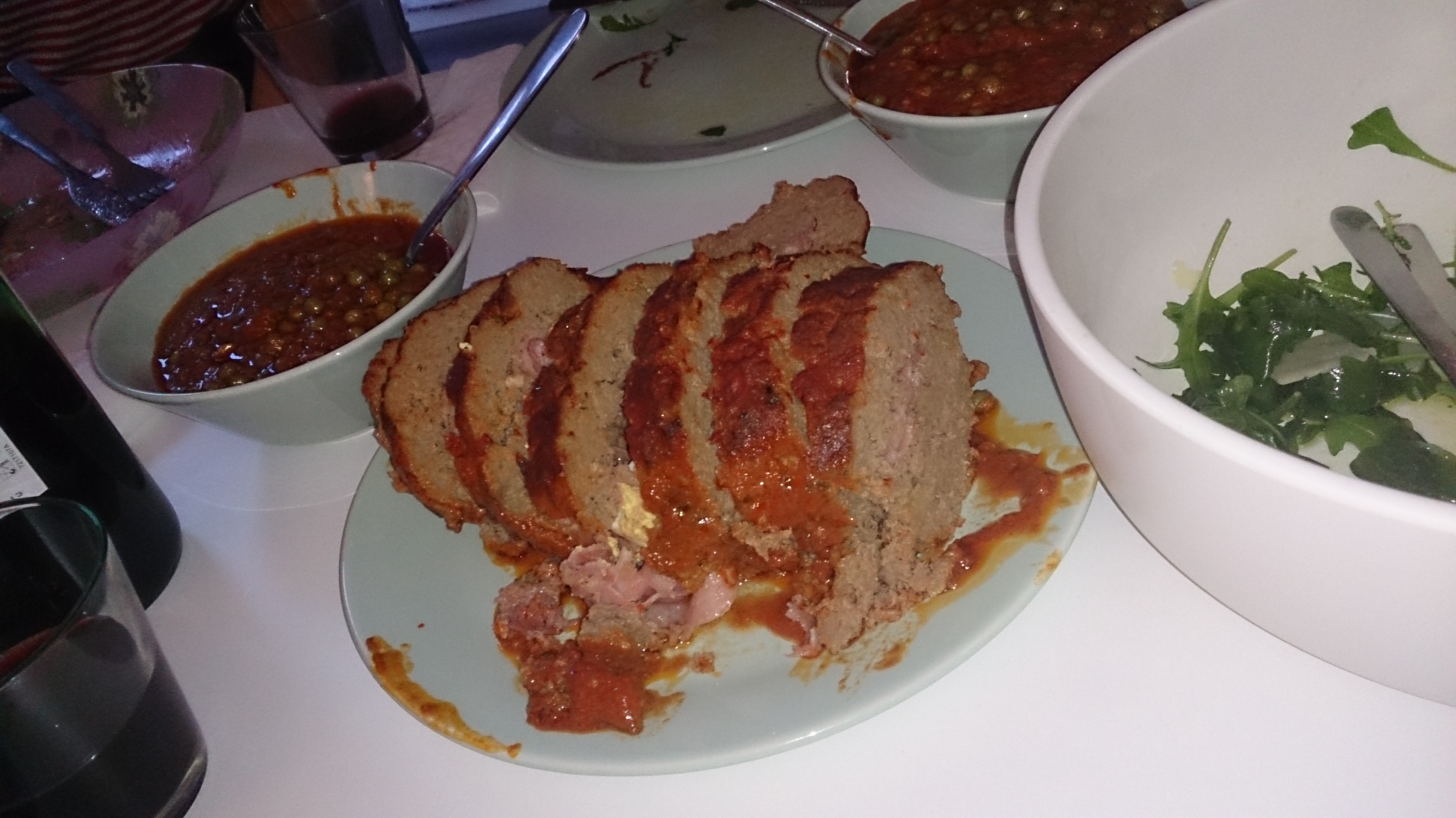 There is a yummy starter (not pictured) that looks like ham but is made from beef: Carpaccio, done with Bresaola and Rucola (rocket) and parmesan cheese (Parmiggiano a scaglie)— all seasoned with “a special kind of vinegar”: Aceto Balsamico. Peas cooked with onions, ham and butter make the side dish: Piselli al Burro in Italian. And the mother of them all is the bigass meat loaf that behaves like a multi-flavored lollipop; with every dig, I discover something new inside – cheese, ham then boiled eggs. This is “something we do in Sicily,” Lucia says of the sliced minced meat: Polpettone (In Italian polpetta means meatball so Polpettone literally means grande Polpetta).