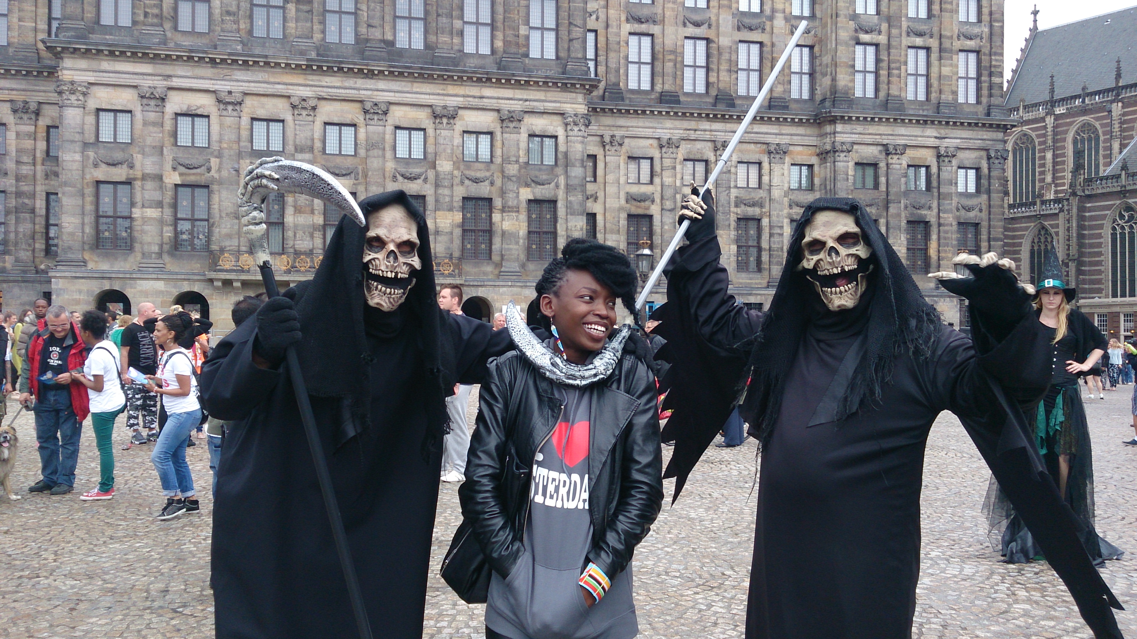 On a different day when Danny is in Amsterdam to fix his mac, NL is playing against Costa Rica at 2014 World Cup semi finals. While in NL I am always missing Danny’s calls because I am always out shopping or at a gig and he always misses mine because, well … he works at ICC. Ahem. “Do you realize we just had our first phone conversation in NL, today?” We laugh when he calls me, later meet and end up doing a lot of things including taking pictures with Dam Square’s Grim Reapers and at Rembrandt Square’s 3D Sculptures. We also enjoy some deathly sugar-free Espresso by a random café’s patio before taking a boat ride (where we see a boat full of orange-dressed people – super cool!) around the city.